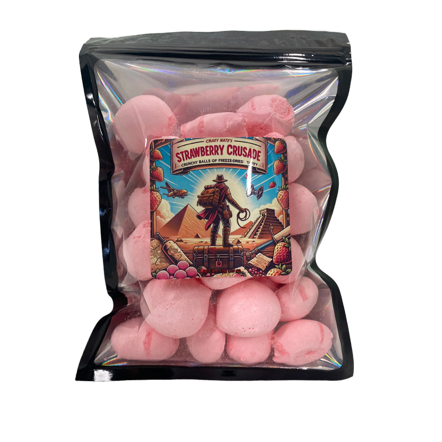 Get ready for a tasty adventure with Strawberry Crusade™! We start with top-quality taffy from Taffy Town, packed with the sweet, juicy flavor of fresh strawberries. Then, we take it to the wilds of Montana, where it's freeze-dried to crunchy perfection. Packed in handy resealable bags to keep every bite fresh, these treats are perfect for any explorer looking for a sweet snack. Dive into the delicious crunch of Strawberry Crusade™ and let your taste buds go on a wild ride!